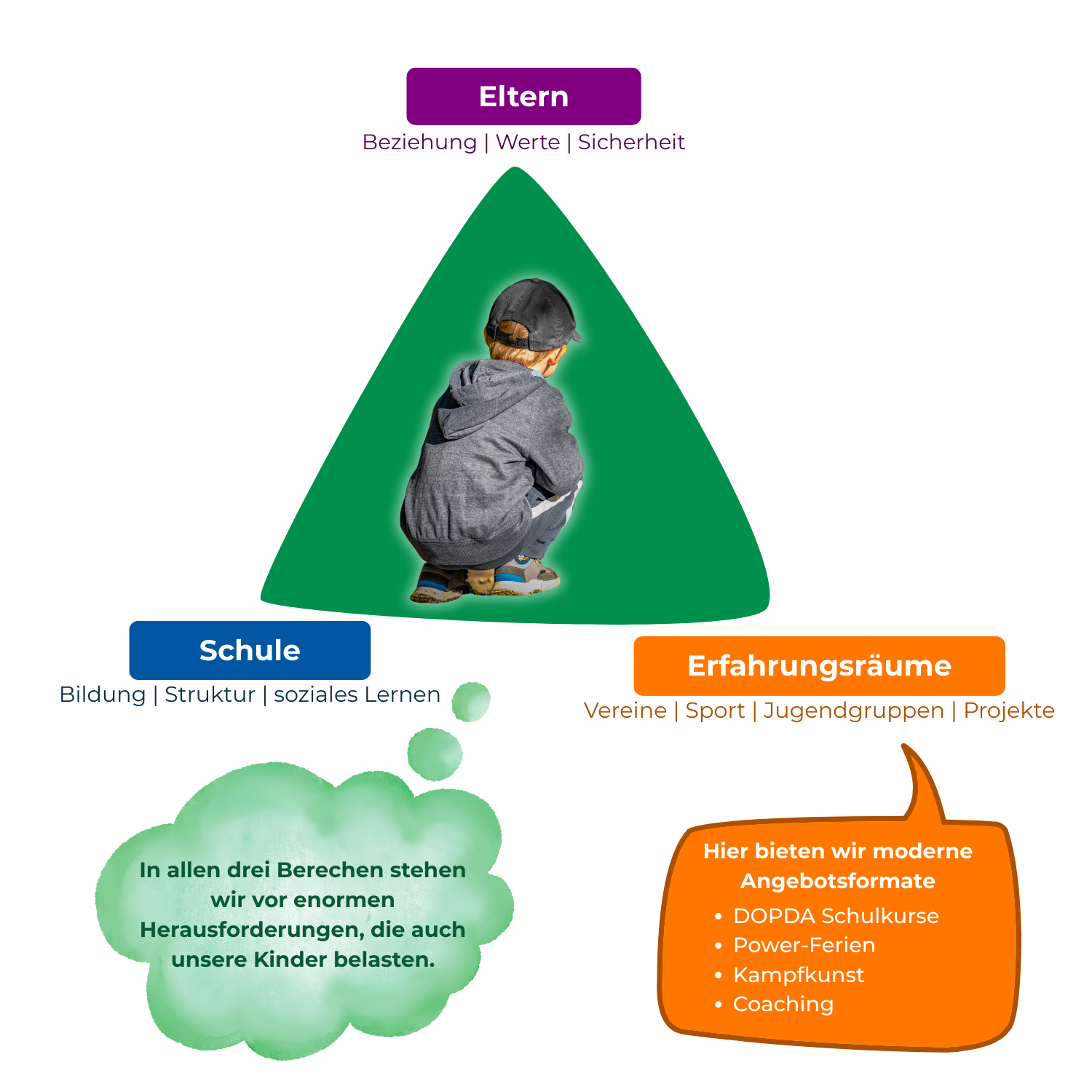 Die Entwicklung junger Menschen findet nicht nur in einem einzelnen Umfeld statt. Wichtige Entwicklungsräume sind dabei vor allem die Familie und die Schule, aber auch weitere soziale Erfahrungsräume wie der Freundeskreis, der Sportverein oder Freizeitgruppen.